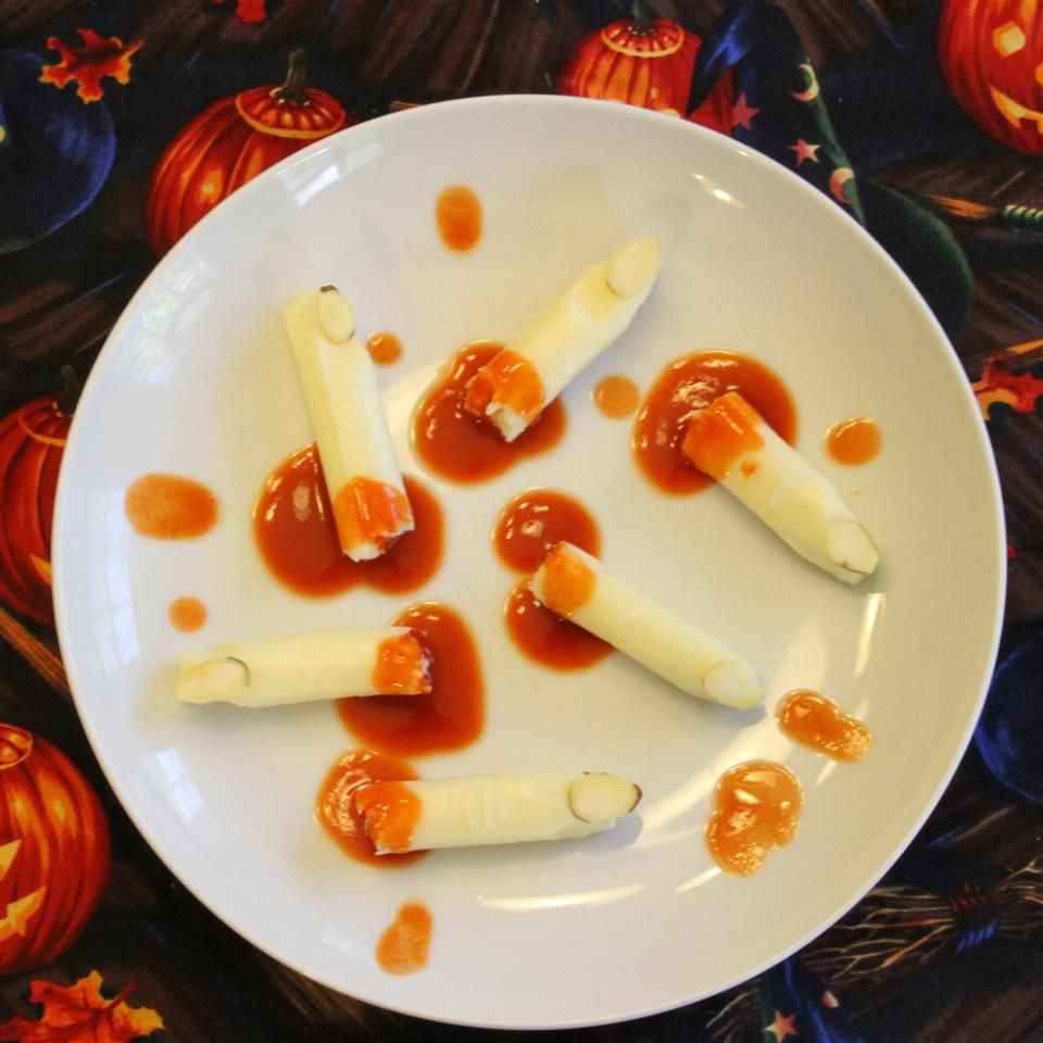 - Step 4:Pour several drops of hot sauce into small pools of "blood" on a serving plate. Dip torn ends of the cheese fingers into "blood" to resemble bloody fingers. Lay each "finger" in its own pool of "blood".